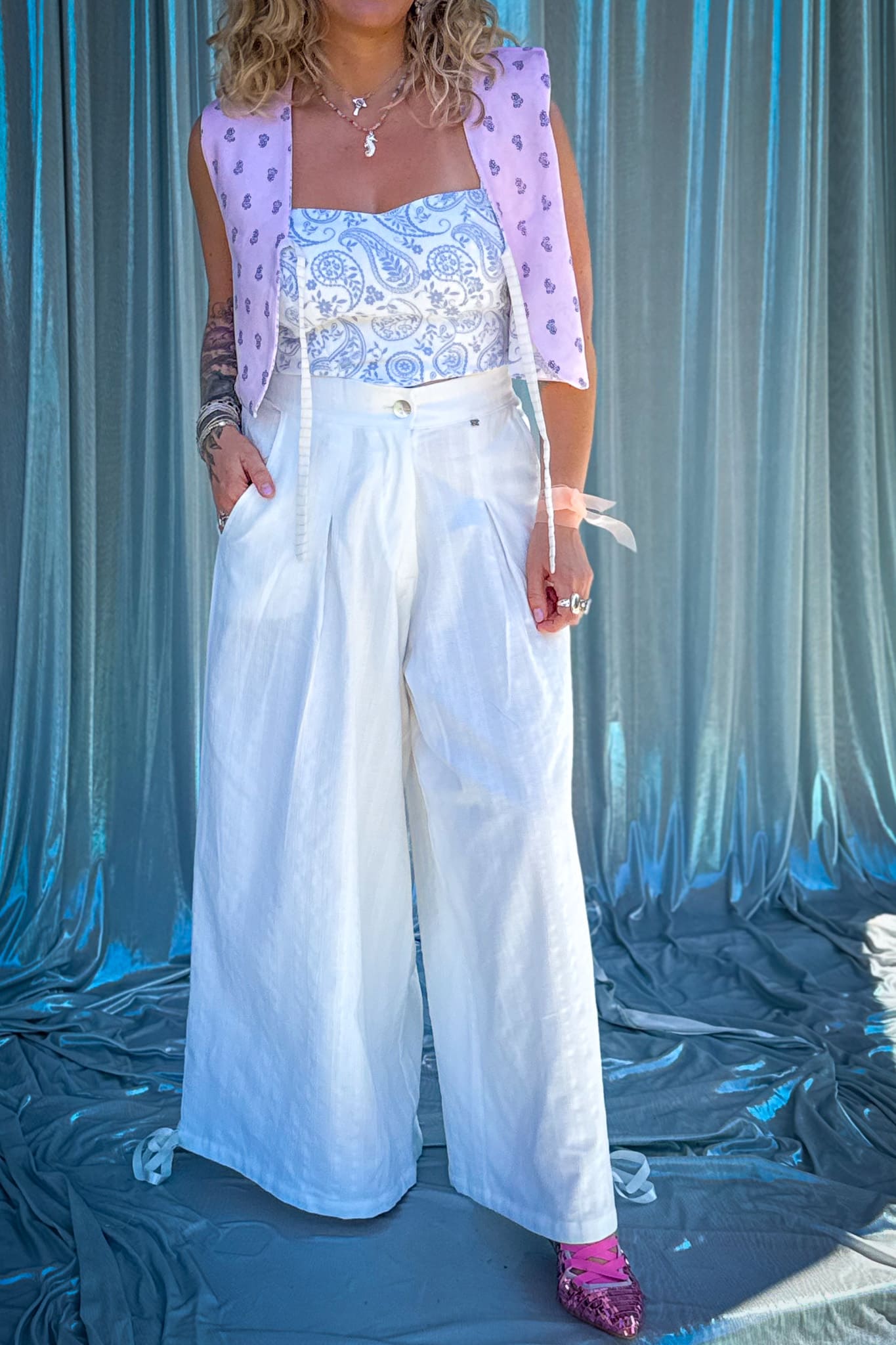 Este pantalón es parte de un set de 3 piezas confeccionados a tono y en la misma tela para poder vestir un traje de verano elegante y fresco (las piezas se venden por separado).