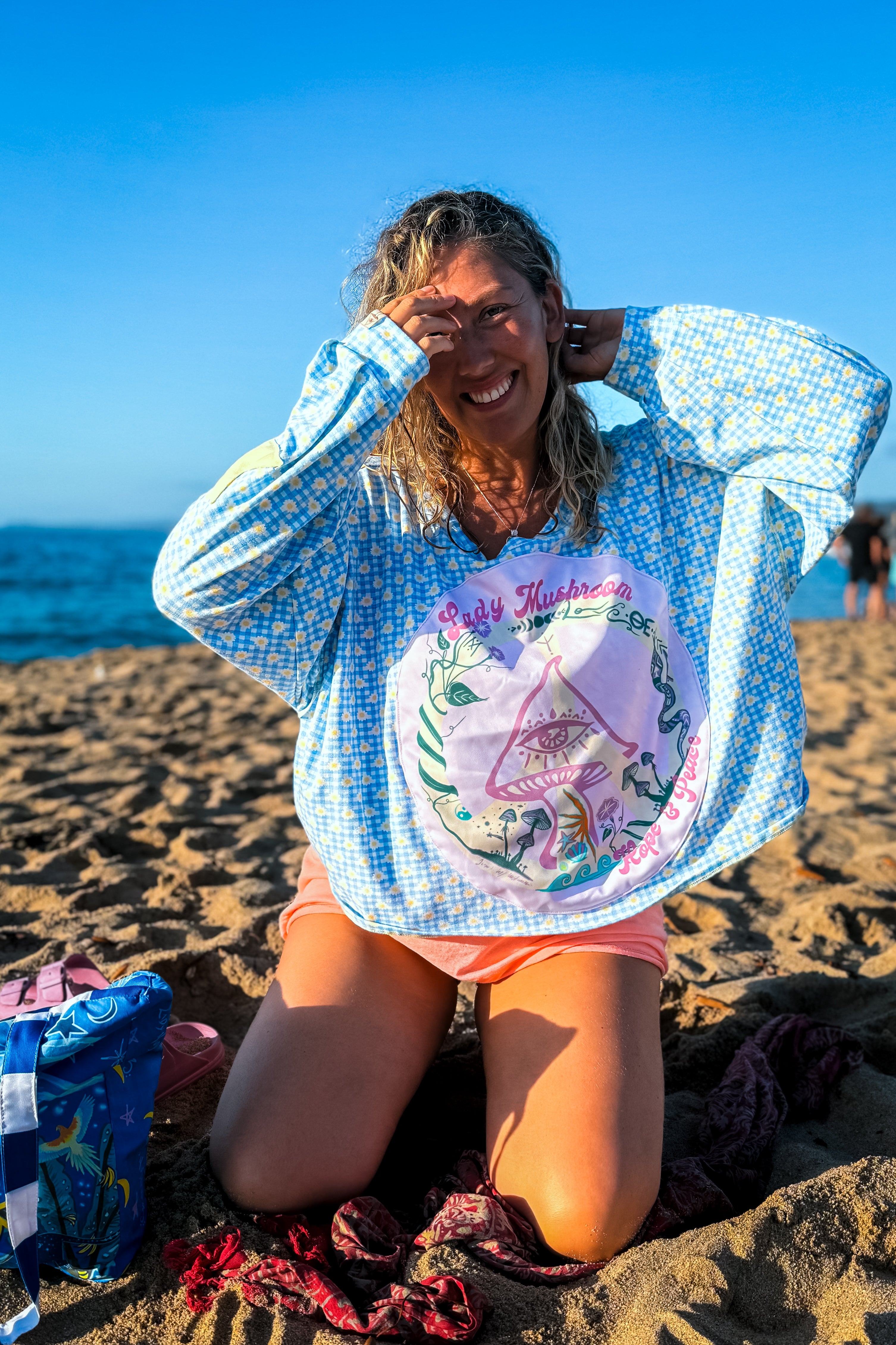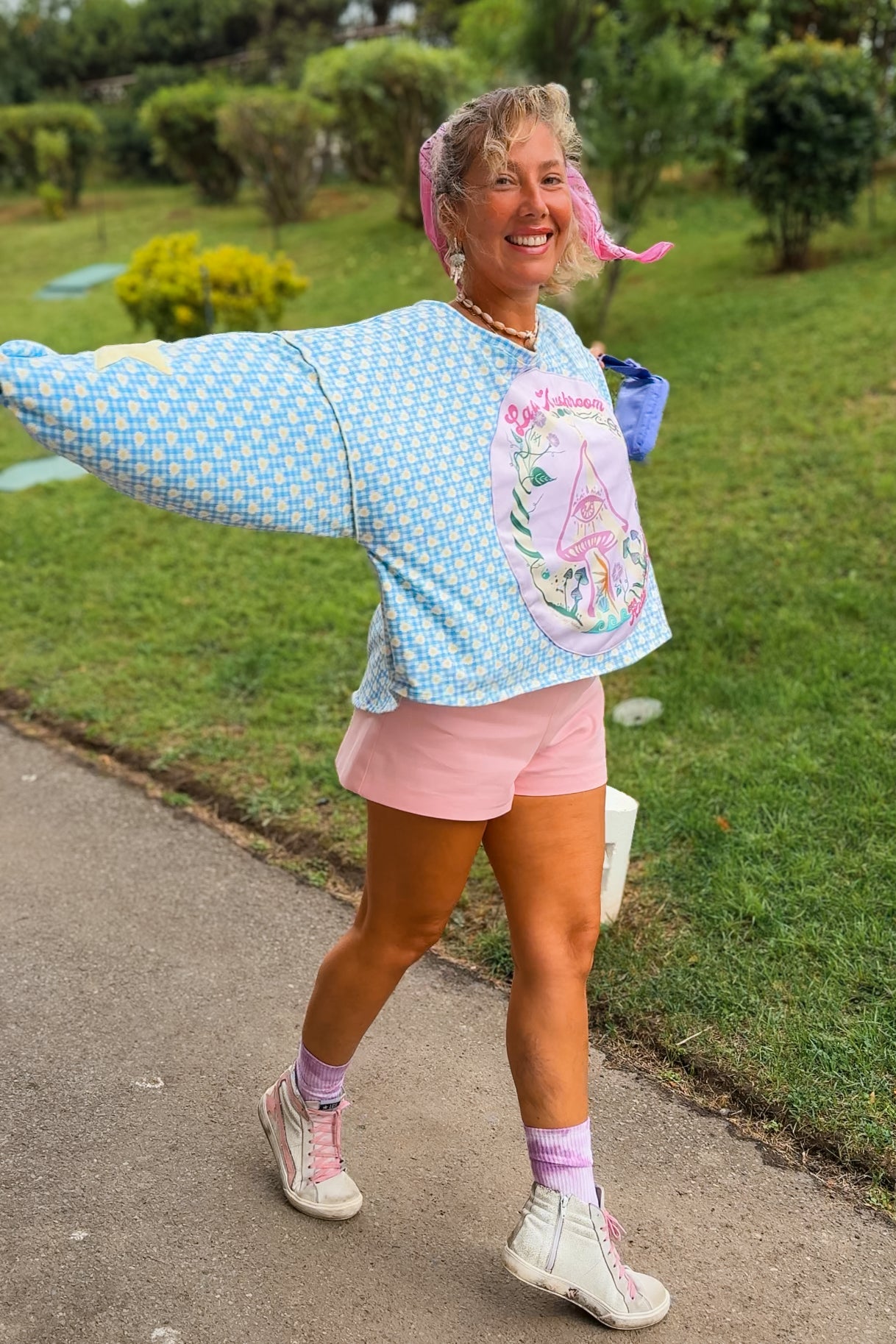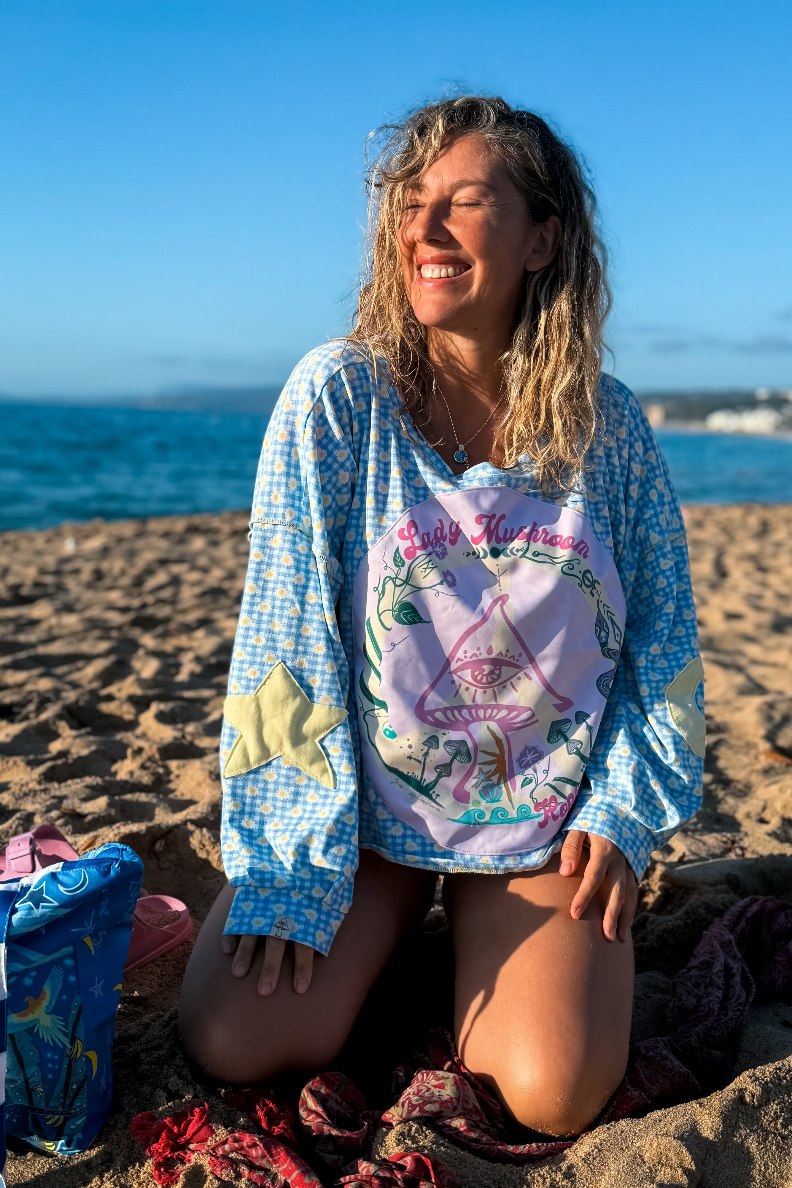 Su comodidad y suavidad son espectaculares. Fabricado en algodón 100% peruano sin carda, con nuestra ilustración llena de colores y detalles, inmersa en un minimundo característico de Lady Mushroom, con símbolos y dibujos mágicos de protección y buena onda, con ese toque veraniego “Hope & Peace”.