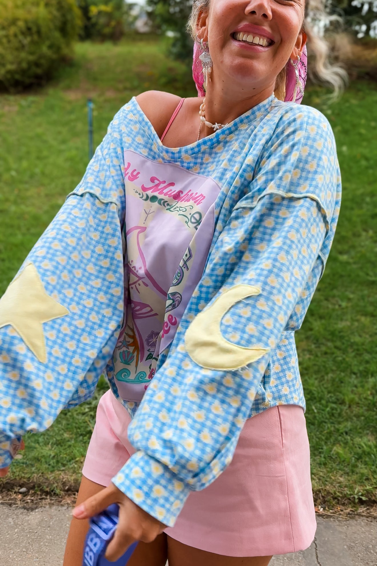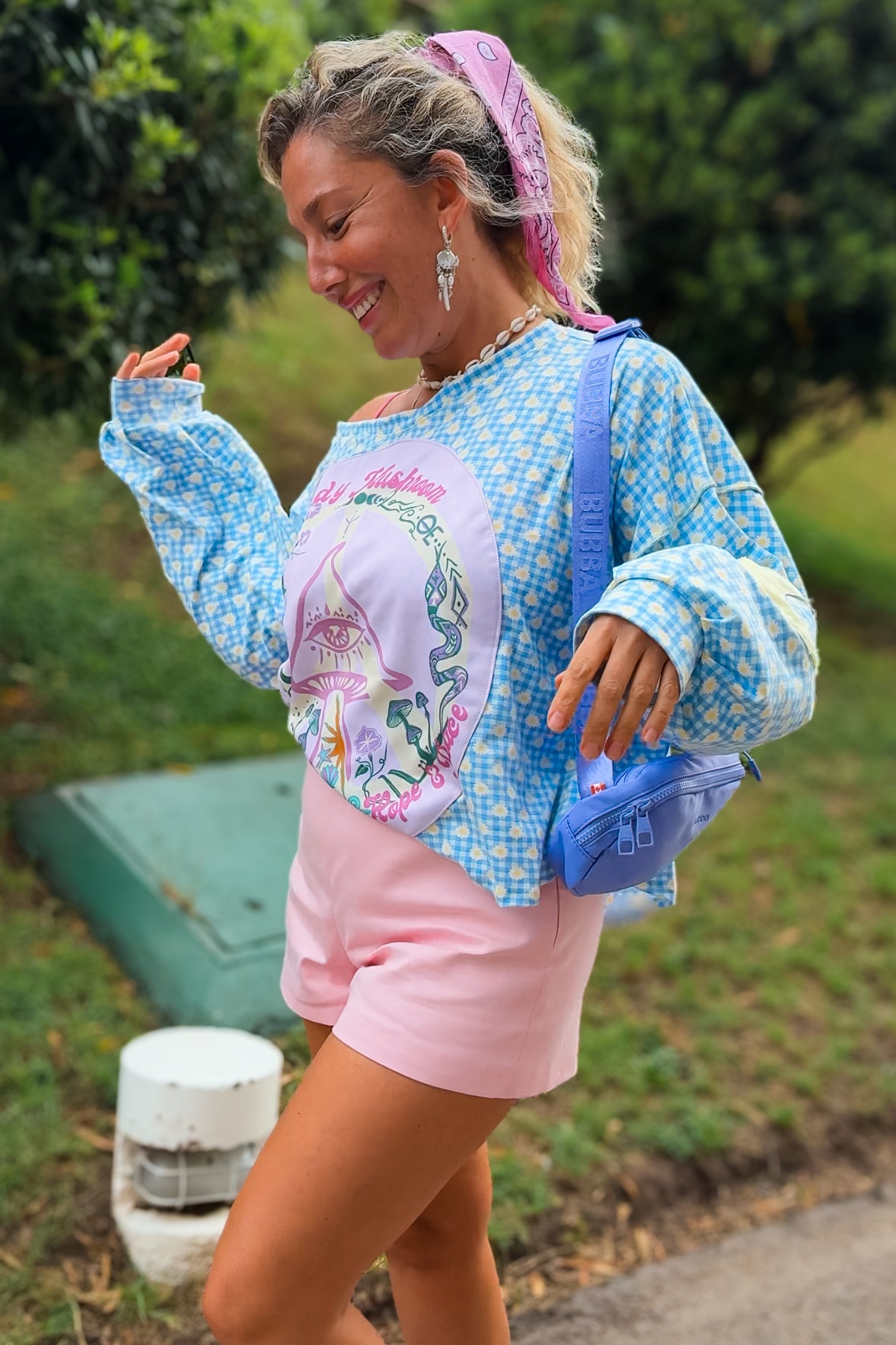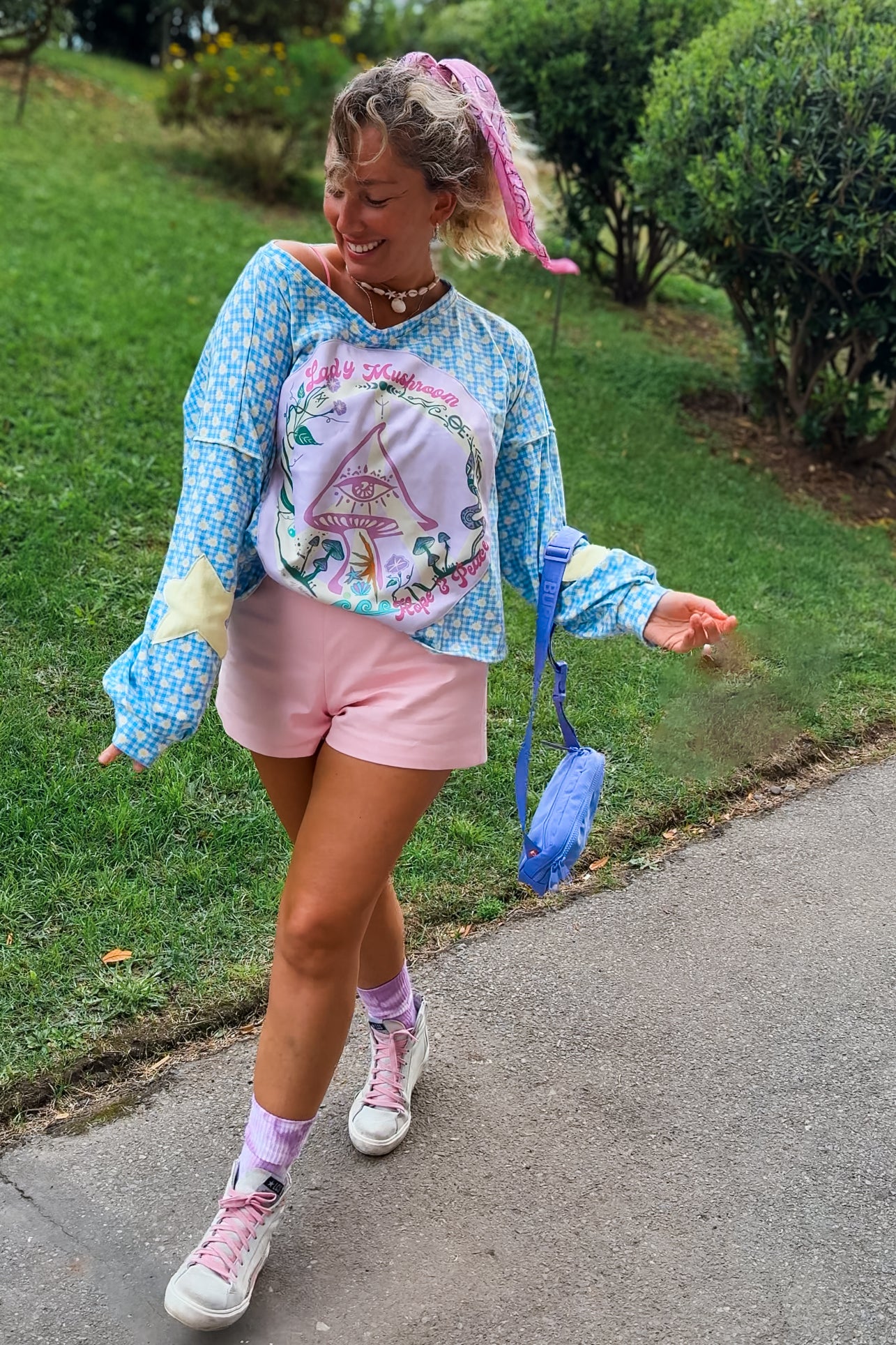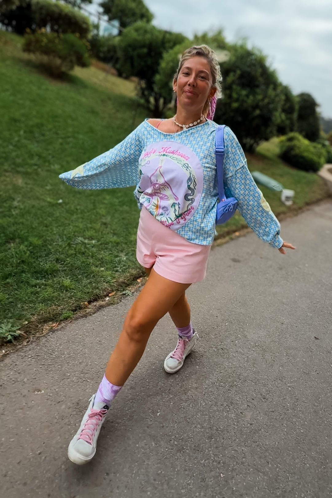 Su comodidad y suavidad son espectaculares. Fabricado en algodón 100% peruano sin carda, con nuestra ilustración llena de colores y detalles, inmersa en un minimundo característico de Lady Mushroom, con símbolos y dibujos mágicos de protección y buena onda, con ese toque veraniego “Hope & Peace”.
