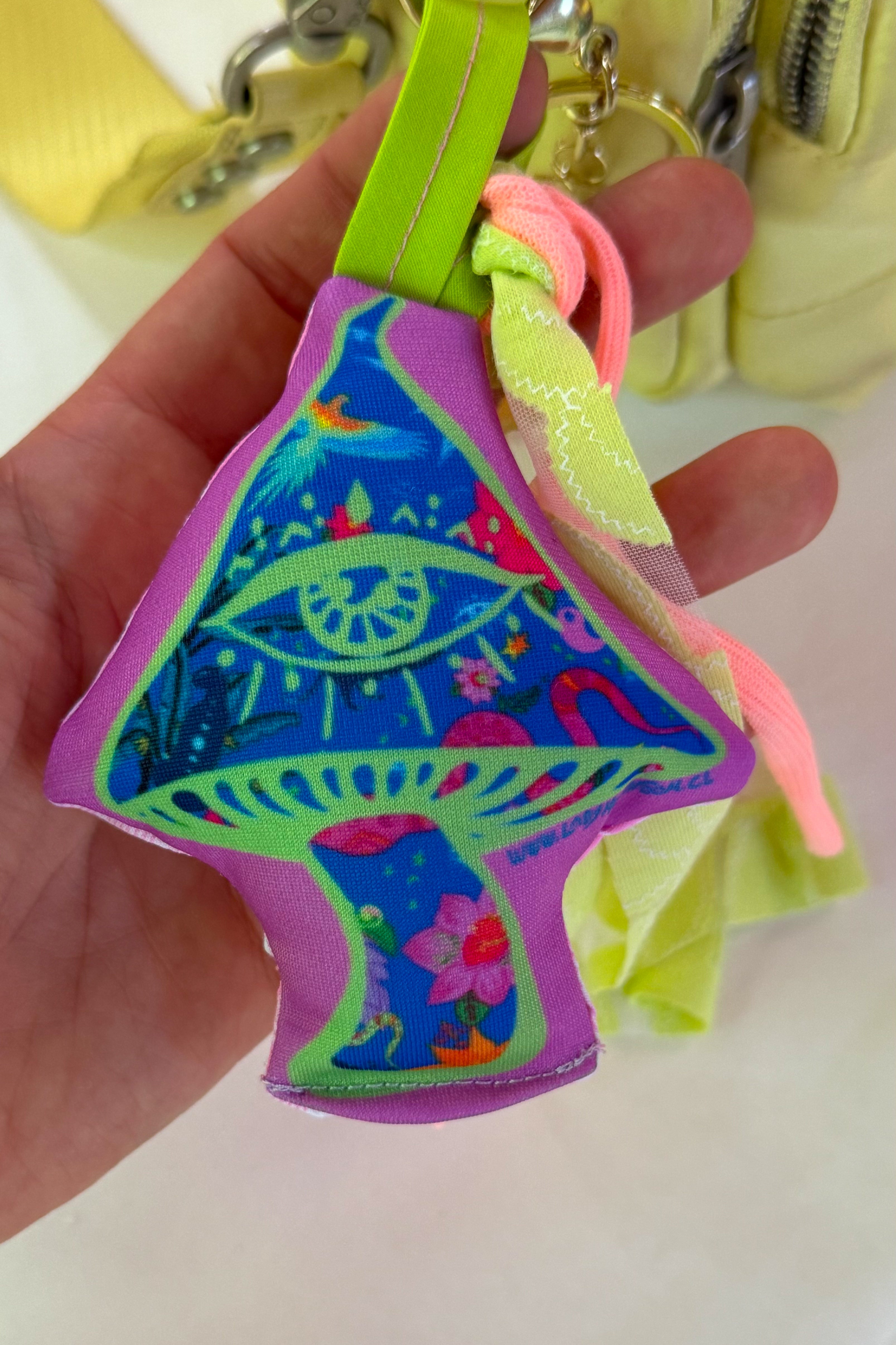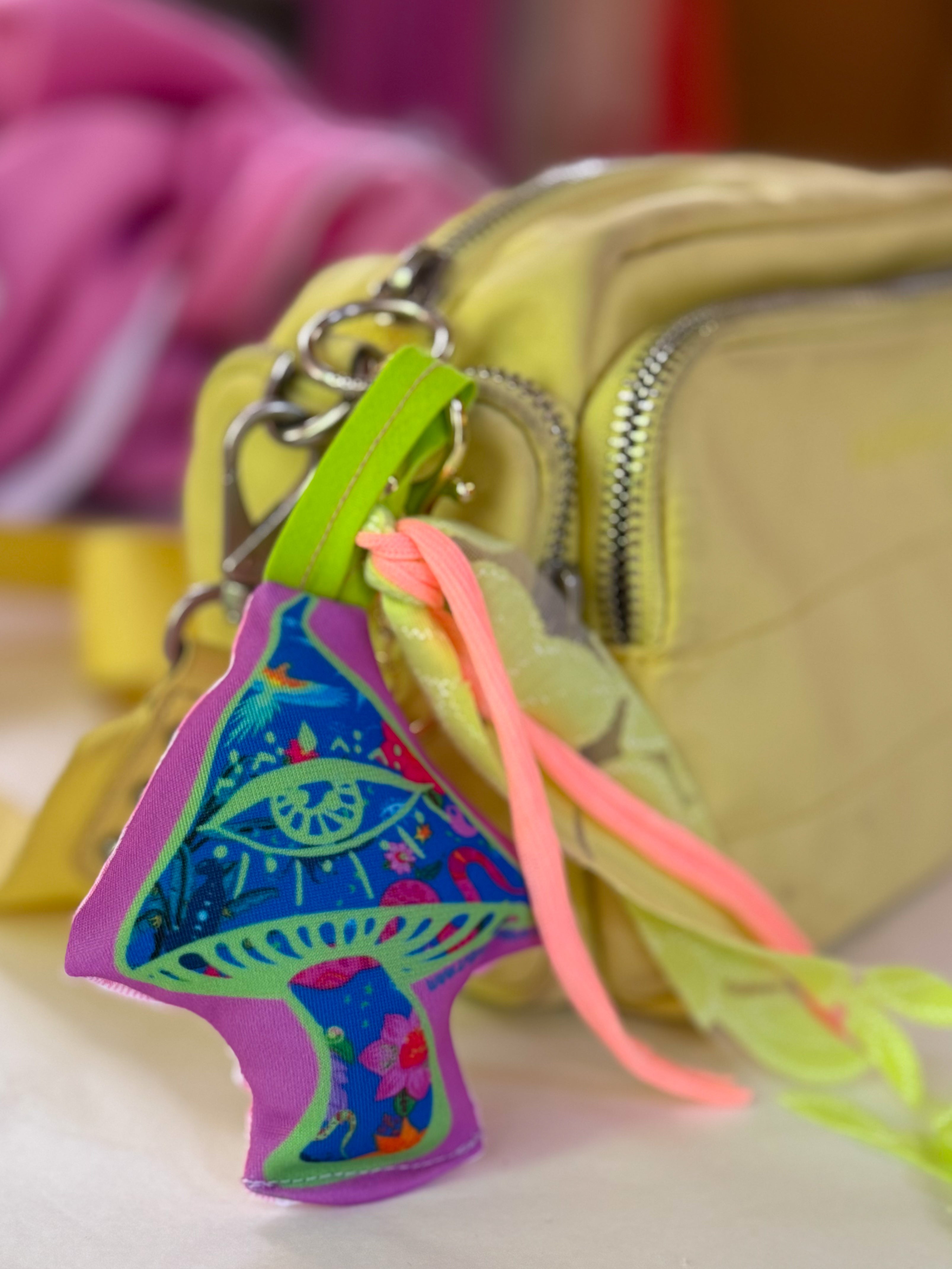Este llavero ilustrado por nosotras está pensado como un pequeño amuleto: un hongo de la buena suerte que te acompaña donde vayas.